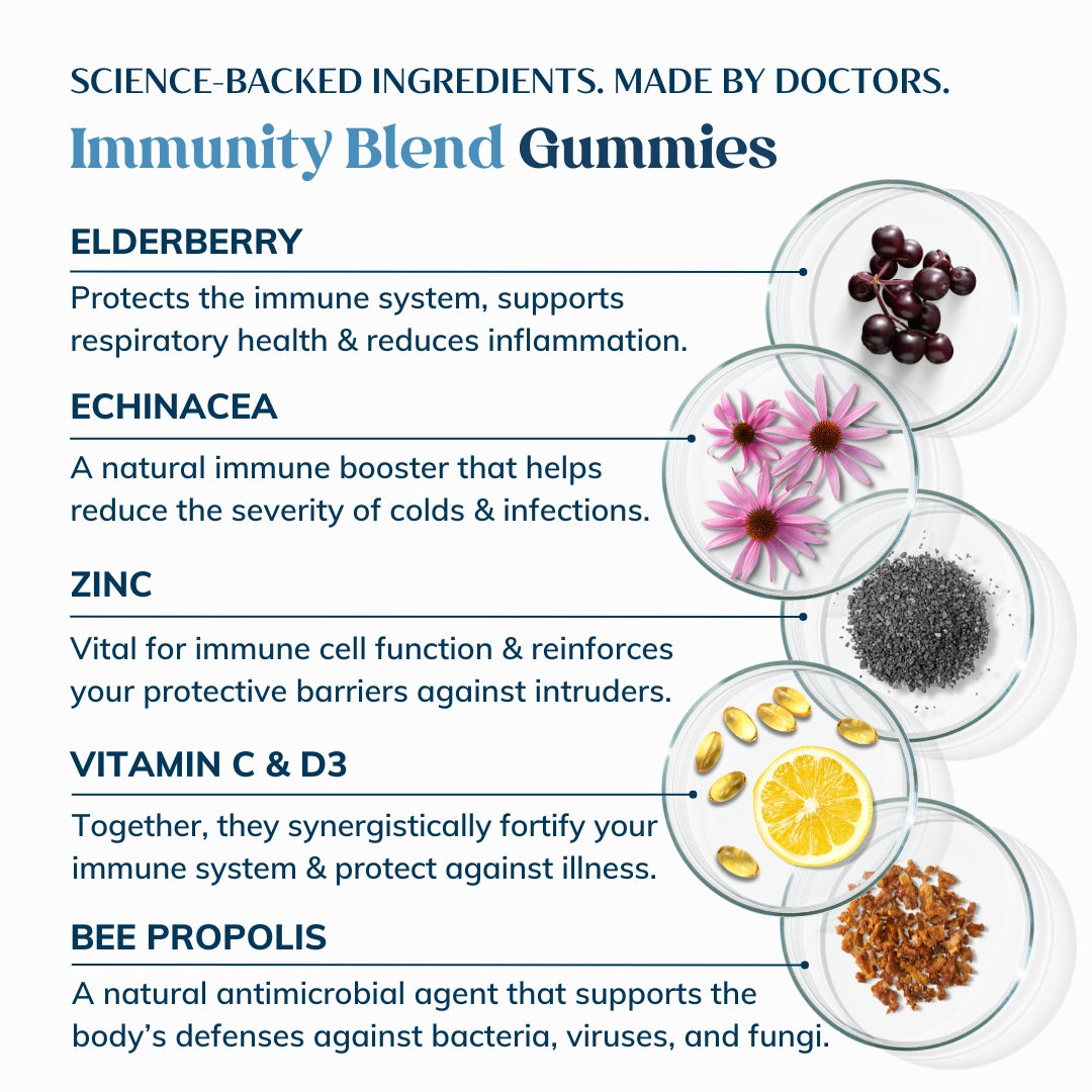 A powerful blend of Elderberry, Echinacea, Vitamin C, Vitamin D3, and Zinc works synergistically to enhance your body’s natural defenses, keeping you protected year-round.