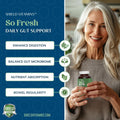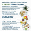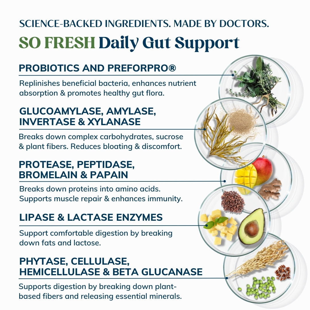So Fresh provides long-term daily support for your gut health. Its blend of probiotics, including Bacillus coagulans and Lactobacillus acidophilus, helps restore the balance of good bacteria in your gut, promoting improved digestion and nutrient absorption. Prebiotics like PreforPro® feed the beneficial bacteria, enhancing their growth and efficiency. Digestive enzymes such as Amylase, Protease, and Lipase further assist in breaking down food, reducing digestive discomfort, and ensuring your body gets the nutrients it needs.